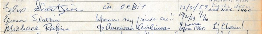Saturday, January 9, 1960: ”Call from Calif – Green Lite on Project (Christmas Album) for antiphonal string Stg Orch for Slatkin – Liberty – Start Sketching 630” / Sunday, January 10: ”Complete Sketch + Arr. #1 (First Noel)” / Wednesday, January 20: ”Score #2 for Felix God Rest ye, Merry Gentlemen / Monday January 25: Sketch #3 (It Came Upon a Midnight Clear)” / Tuesday January 26: ”Score #3) / Wednesday January 27 ”Sketch + partially score #4 (Adeste Fideles) / Monday, February 1 ”Complete Sketch and Scoring of #4 (ADESTE FIDELES) / Thursday February 4: ”Work on Score #5” / Saturday February 6:”Completed Scoring on #5 (Hark! The Herald Angels Sing) / Thursday February 11: (Work on #6) / Friday, February 12: ”Complete #6 (Deck The Halls) Sketch + Score #7 (Silent Night) / Monday February 29: ”Complete Scoring on #8 (O Holy Night) / Friday March 4: ”Complete Sketch and Scoring of #9 (White Christmas) / Saturday March 5:”Sketch # 10 (Joy to the World)” / Tuesday March 15: ”Sketch #11 (Away in a Manger) / Saturday March 19 ”(Complete #11 AWAY IN A MANGER)” / Monday April 4: ”work on # 12” Tuesday April 5: ”Complete #12 I heard the bells on Christmas day” [Project Slatkin Completed]”